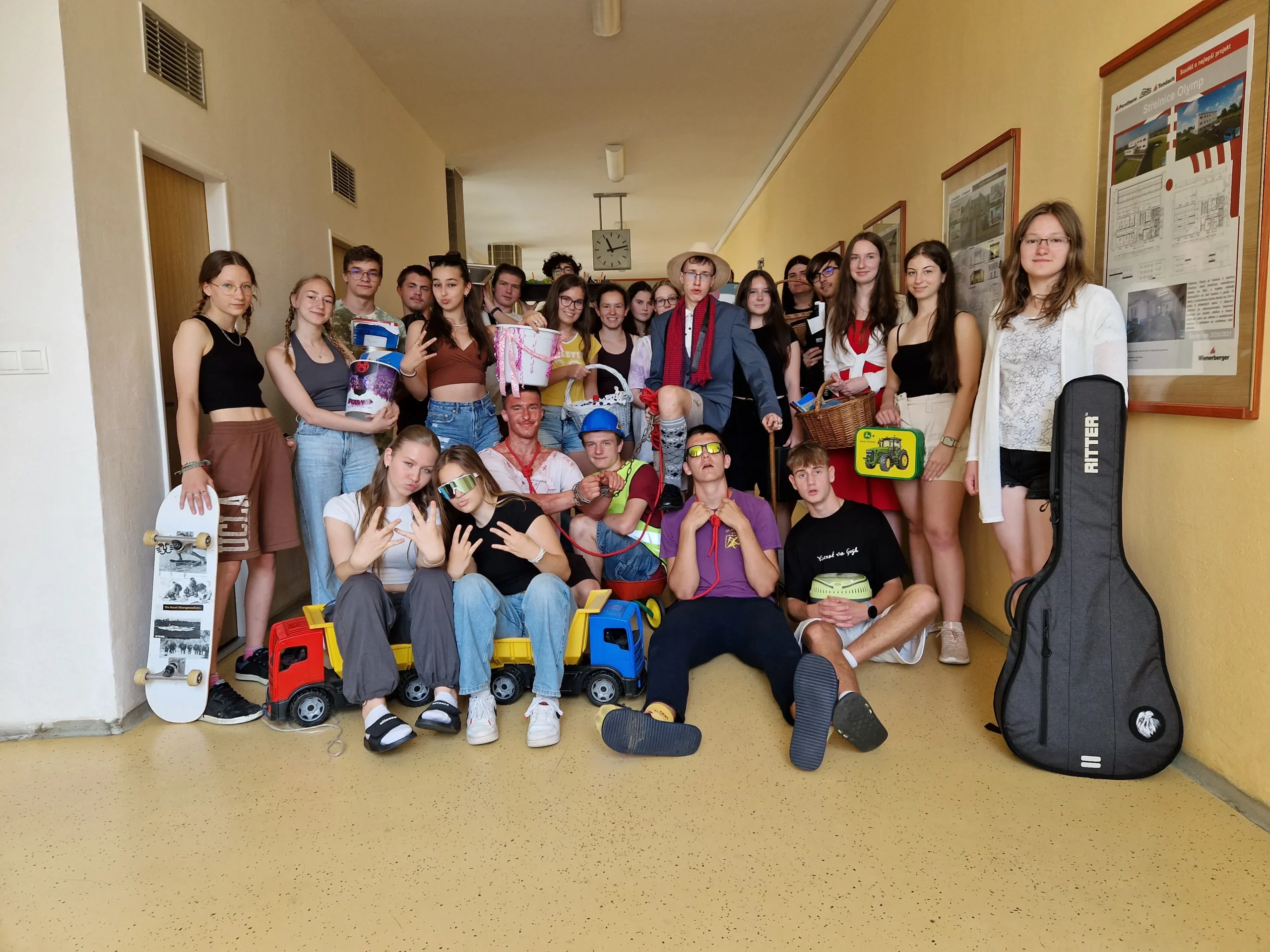 Tolik kreativity a hravosti jako na No BackPack Day už jsme na stavebce dlouho neměli. Fotky poslalo jen několik tříd, ale po celé škole jste mohli narazit na spoustu roztodivných outfitů s kufry, kufříky, košíky, klecemi, kolečky, dětskými kolečky, tatrovkami, květináči… A 2. L fikaně usoudila, že nejlepší taška je auto jejich třídní!