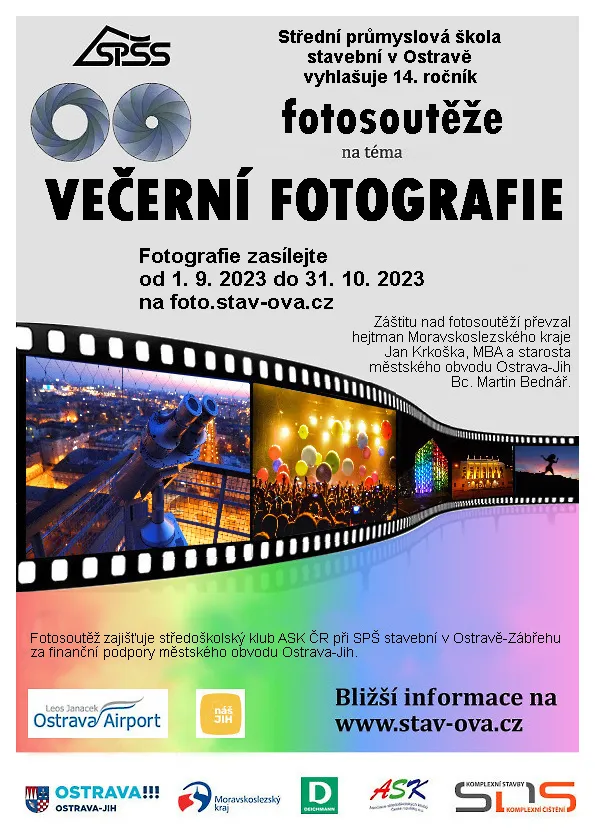 Rádi fotíte? Máme pro vás výzvu – večerní fotografii! Naše škola a Asociace středoškolských klubů ČR pořádají již čtrnáctý ročník fotosoutěže, která je tradičně určena všem milovníkům fotografování a zejména pak středoškolákům. Podělte se tedy s námi o své výtvory a pošlete nám je na www.stav-ova.cz. Autory nejlepších fotografií samozřejmě odměníme věcnými cenami.
