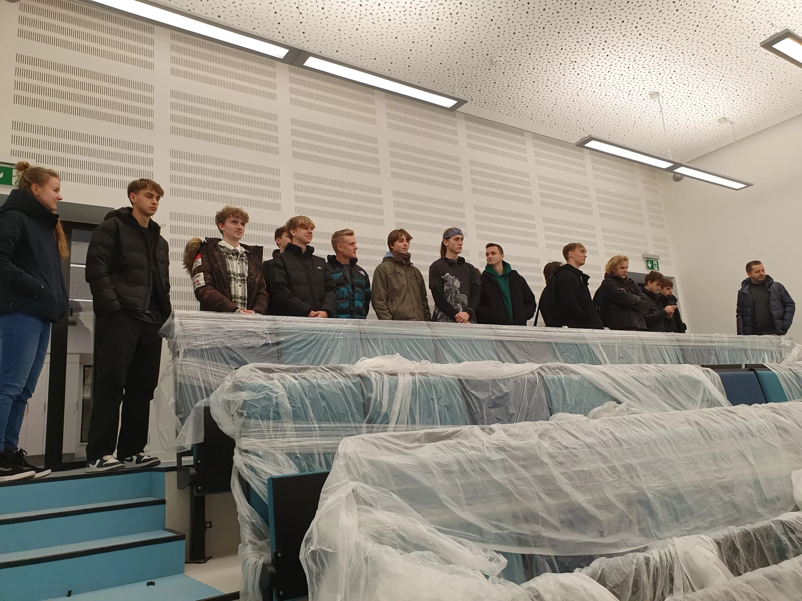 Během prohlídky se studenti z odborného výkladu Ing. Pavla Hynčici dozvěděli nejen informace o technickém provedení a finanční stránce projektu, ale také o důležitosti barevného pojetí vnitřní části objektu. Barvy napomáhají tomu, aby se návštěvník neztratil a hned věděl, v jaké zóně se nachází. Budova je řešena pomocí moderních prvků, které jistě přispějí k lepším studijním a sportovním výkonům studentů. Objekt se nám moc líbil, a protože bude od února přístupný také pro veřejnost, doporučujeme jej k návštěvě.