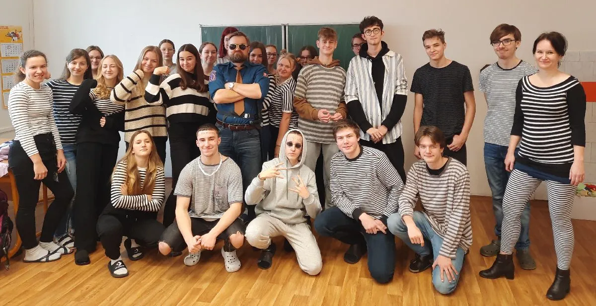 Mimochodem, také učitelskému sboru to v pruhovaném až podezřele slušelo …